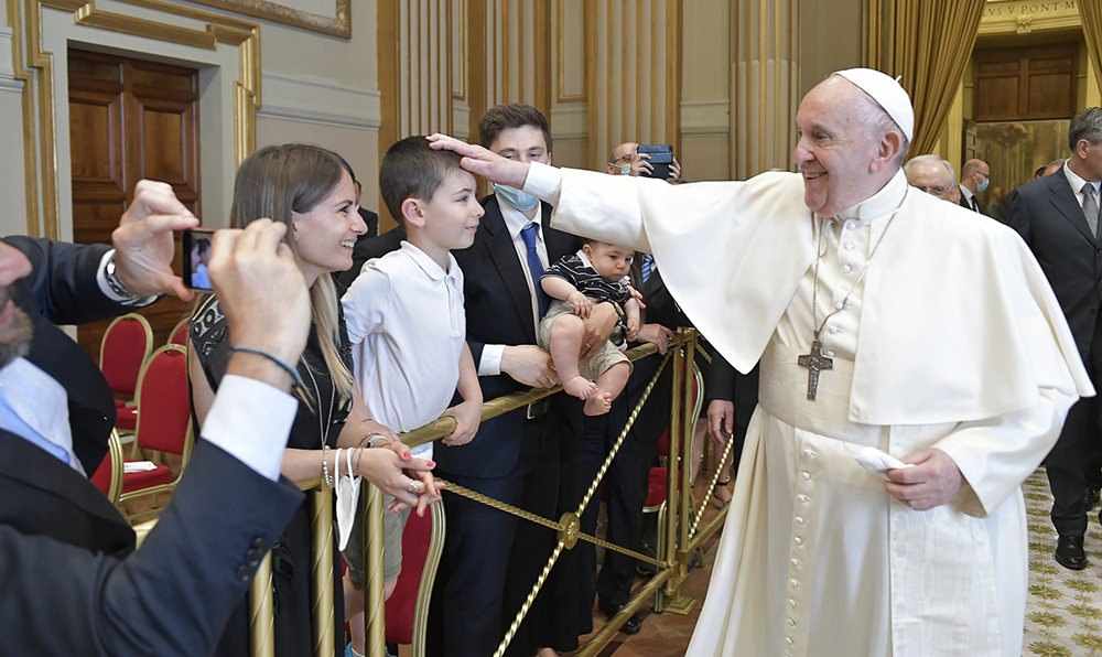 Pope Francis greets a young boy during an audience with permanent deacons of the Diocese of Rome and their families at the Vatican June 19, 2021. (CNS photo/Vatican Media)