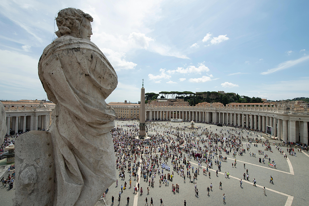 People gather in St. Peter’s Square at the Vatican July 4, 2021, for the Angelus prayer with Pope Francis. The Vatican recently released the names of two commissions charged with assisting the leaders of the Synod of Bishops’ general secretariat in reviewing documents, drafting resources and developing best practices for the 2023 Synod of Bishops on synodality. (CNS photo/Vatican Media)