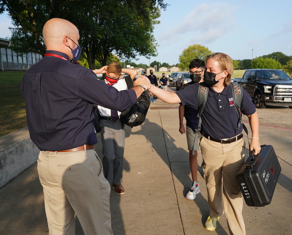 Bishop Dunne Catholic School’s Michael Alfers, left, greets students on the first day of classes at the school on Aug. 9. With concerns about the rising number of COVID-19 cases, Diocese of Dallas Catholic schools have announced that effective Aug. 10, masks will be required to be worn by everyone inside school buildings regardless of vaccination status.