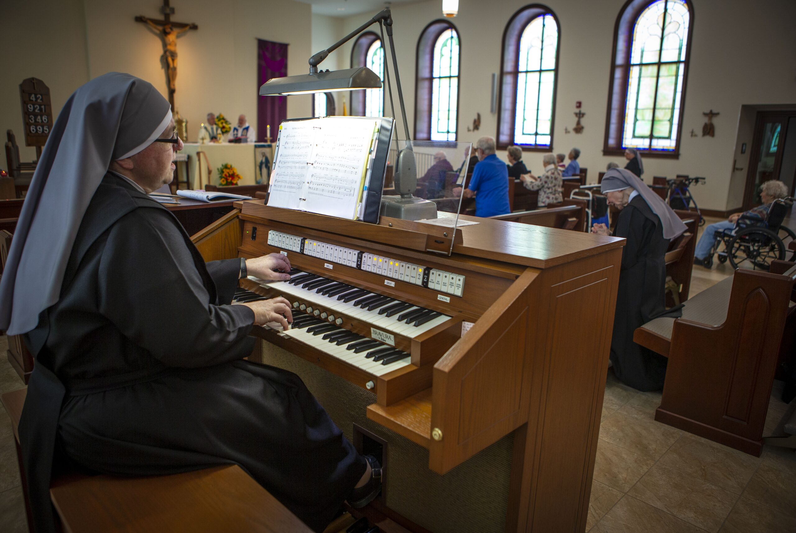 Sister Constance Veit, a Little Sister of the Poor, plays the organ during a March 25, 2019, Mass at the Jeanne Jugan Residence for senior care in Washington. (CNS photo/Chaz Muth)