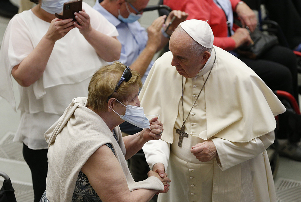 A woman takes her mask off to take a photo with Pope Francis during his general audience in the Paul VI hall at the Vatican Sept. 8, 2021. (CNS photo/Paul Haring)