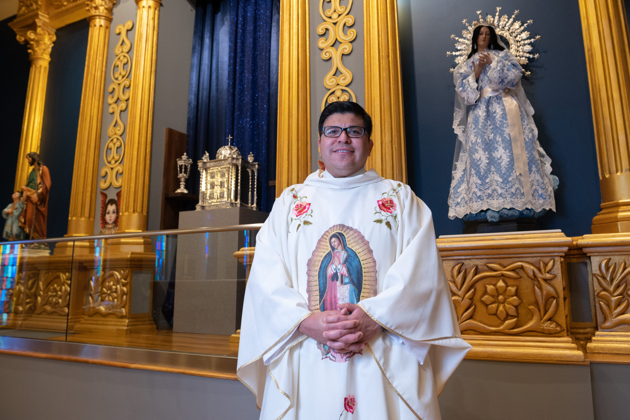 El padre Juan Torres, posa el 23 de agosto en la Iglesia de San juan Diego, con su casulla de la Virgen de Guadalupe obsequiada por los Matlachines de la Catedral de Dallas. Foto: Especial para RC/Ben Torres