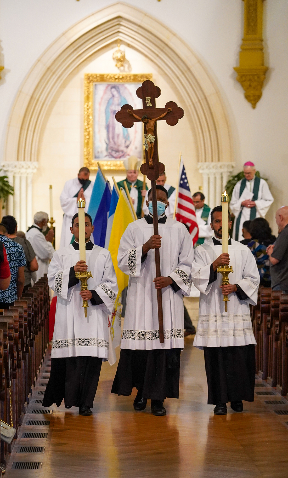 DALLAS— Una procesión de banderas de países latinoamericanos precedió el 7 de agosto pasado la entrada del obispo Edward J. Burns a la Catedral Santuario de la Virgen de Guadalupe, donde se celebró un servicio de oración y bienvenida para menores migrantes.