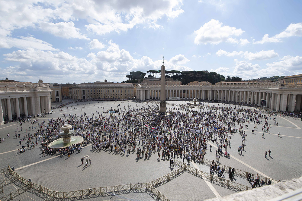 People in St. Peter’s Square attend Pope Francis’ recitation of the Angelus from the window of his studio overlooking the square at the Vatican Sept. 19, 2021. (CNS photo/Vatican Media)