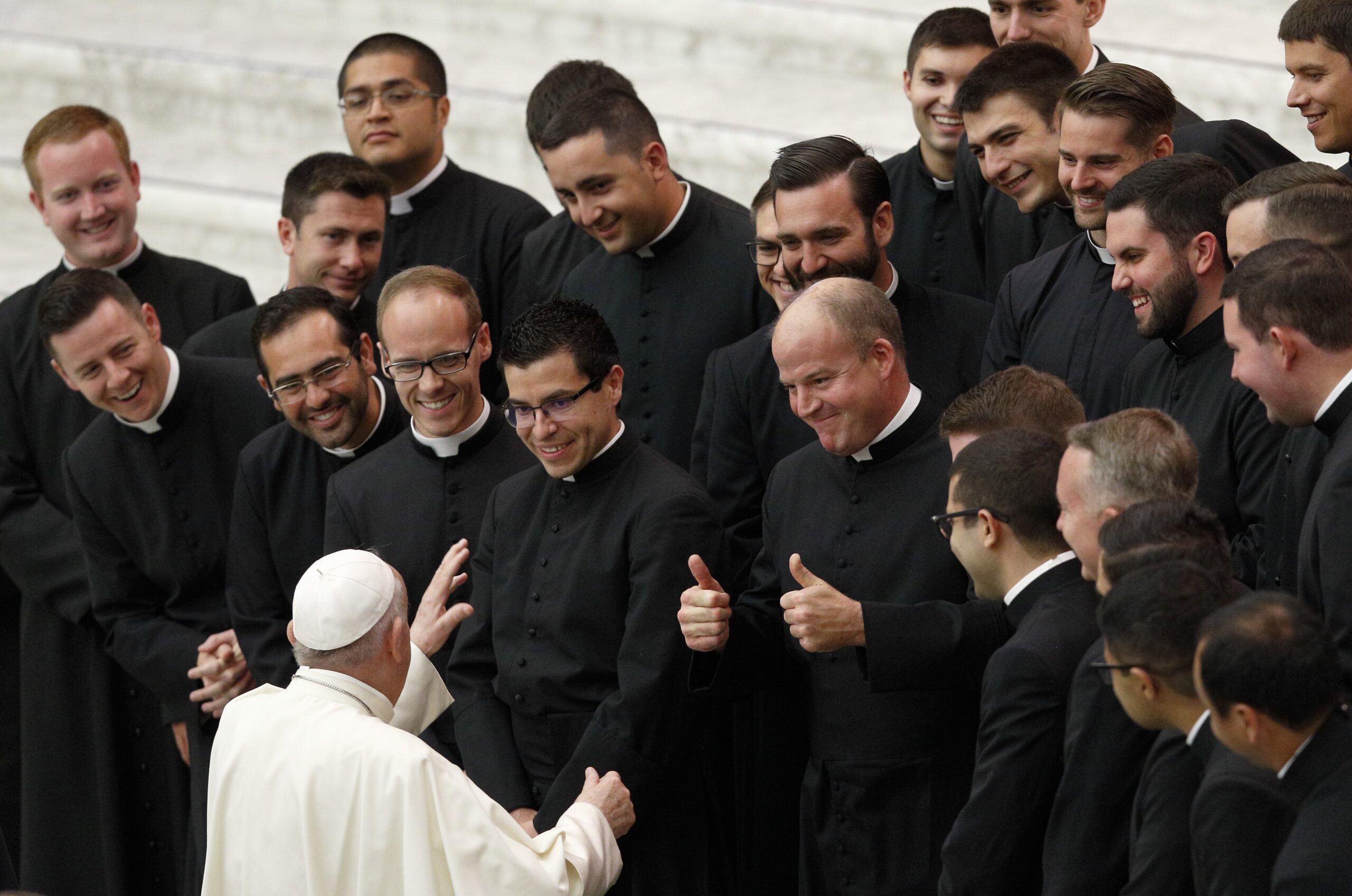 Pope Francis greets seminarians from the Pontifical North American College during his general audience in the Paul VI hall at the Vatican Sept. 29, 2021. Father Peter Harman, rector of the U.S. seminary, is seen giving a thumbs up. (CNS photo/Paul Haring)