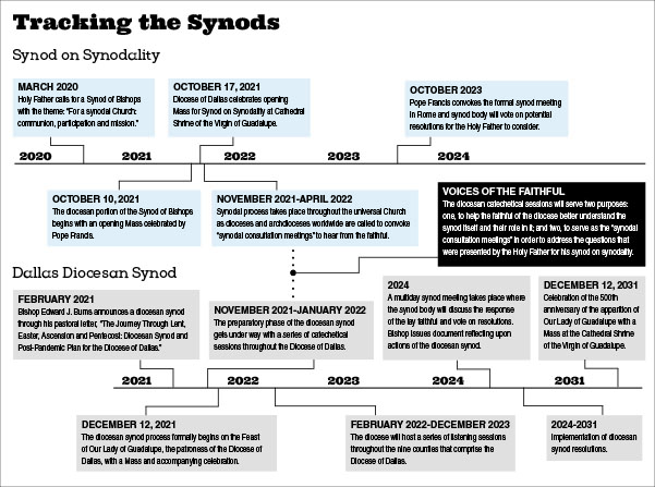 Bishop Burns announced a diocesan synod in February of 2021 through a pastoral letter entitled “The Journey Through Lent, Easter, Ascension and Pentecost: Diocesan Synod and Post-Pandemic Pastoral Plan for the Diocese of Dallas.” You can find this letter at https://www.cathdal.org/synod.