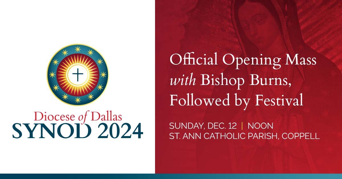 The Diocese of Dallas will mark the opening of the synod process with a special Mass celebrated by Bishop Edward J. Burns on Dec. 12 at St. Ann Parish in Coppell. All are invited to attend this momentous occasion. The day’s festivities include the opening Mass beginning at noon and a family-friendly festival on the grounds of the parish from 11 a.m. to 5:30 p.m. See the signing of the decree officially opening the synod process, learn more about the synod and how you can get involved, and celebrate with members of the community from across the diocese with food, fun, and fellowship.