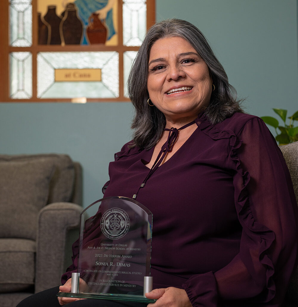 El premio Dei Verbum de la Escuela de Ministerios de la Universidad de Dallas, es un reconocimiento al servicio ejemplar. Sonia Dimas posa con el premio que recibió en mayo pasado. Fotos Especial para RC/Ben Torres