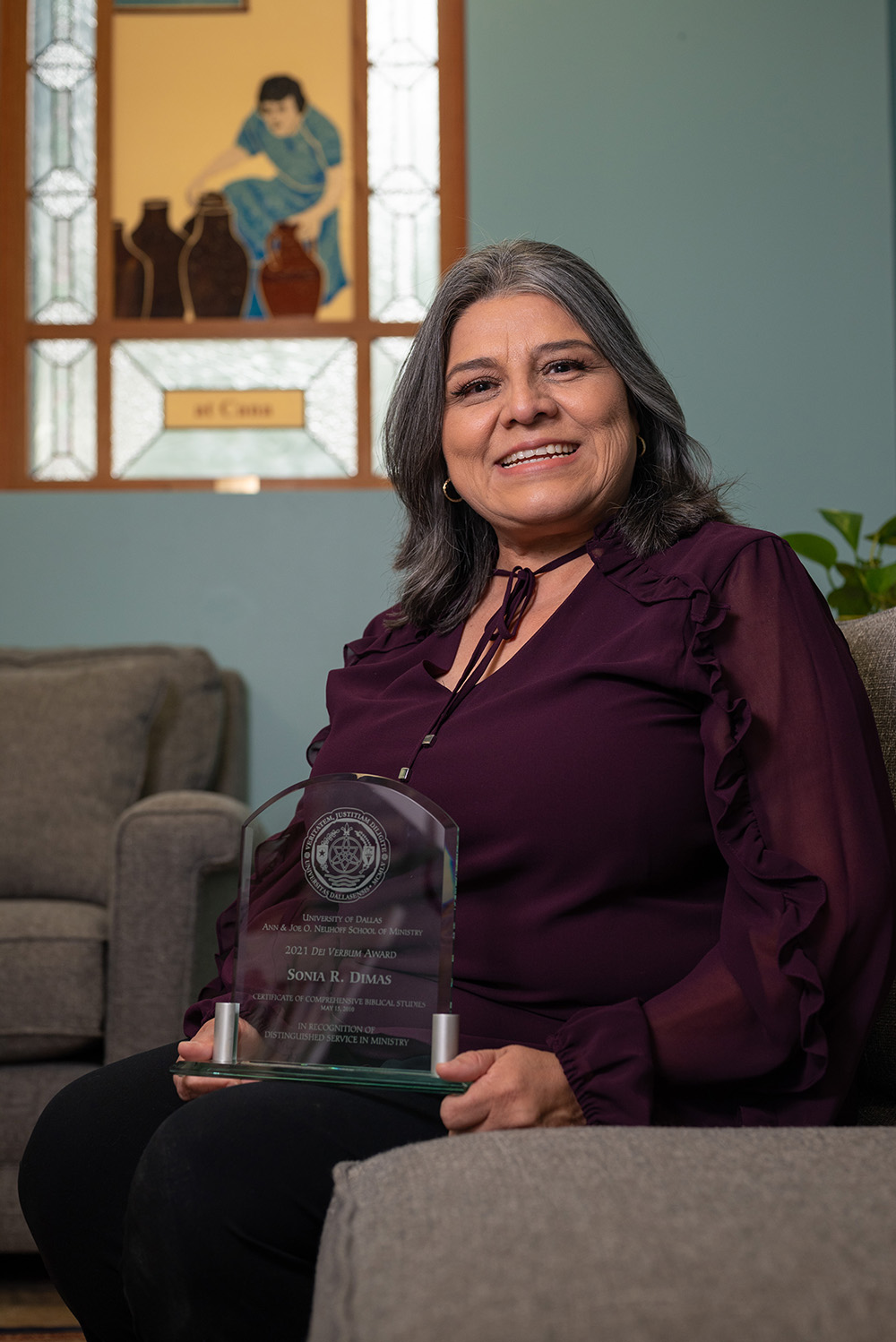 El premio Dei Verbum de la Escuela de Ministerios de la Universidad de Dallas, es un reconocimiento al servicio ejemplar. Sonia Dimas posa con el premio que recibió en mayo pasado. Fotos Especial para RC/Ben Torres