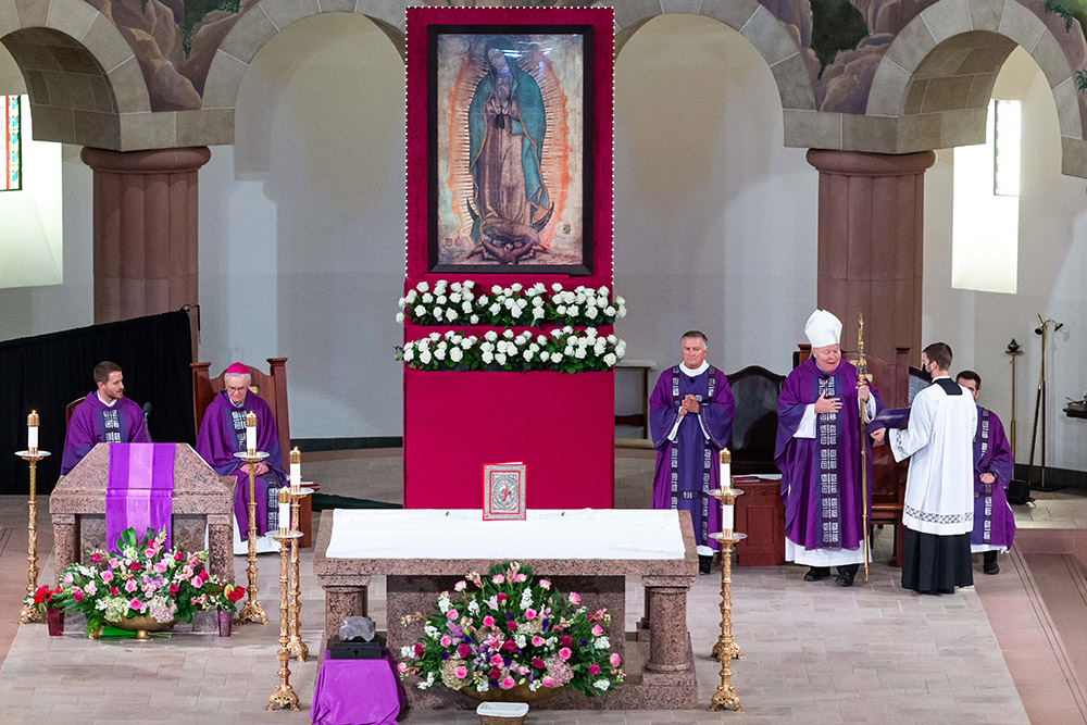 As the signed decree opening the Diocese of Dallas Synod 2024 process remains on the altar, Bishop Edward J. Burns offers a final blessing at St. Ann Catholic Church in Coppell on Dec. 12. (Kevin Bartram/Special Contributor)