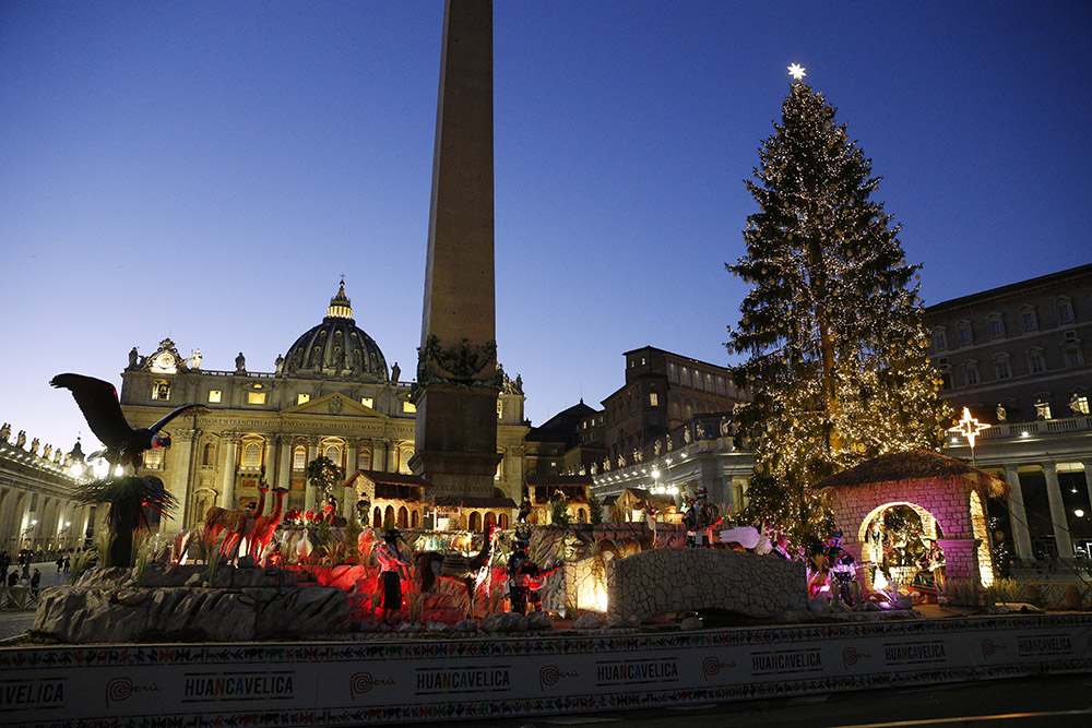 The Nativity scene and Christmas tree decorate St. Peter’s Square at the Vatican Dec. 17, 2021. (CNS photo/Paul Haring)