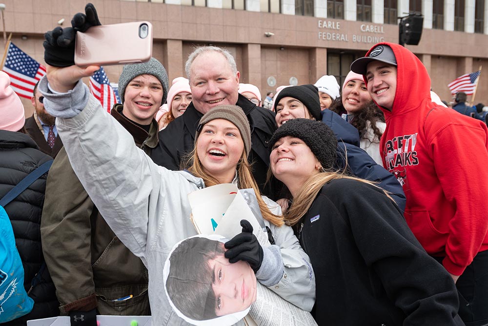 Bishop Edward J. Burns poses for a photo with Maggie Byrne, 18, and other pro-life supporters from St. Francis of Assisi Parish in Frisco during the North Texas March for Life and Rally Jan. 15. (Ben Torres/Special Contributor)