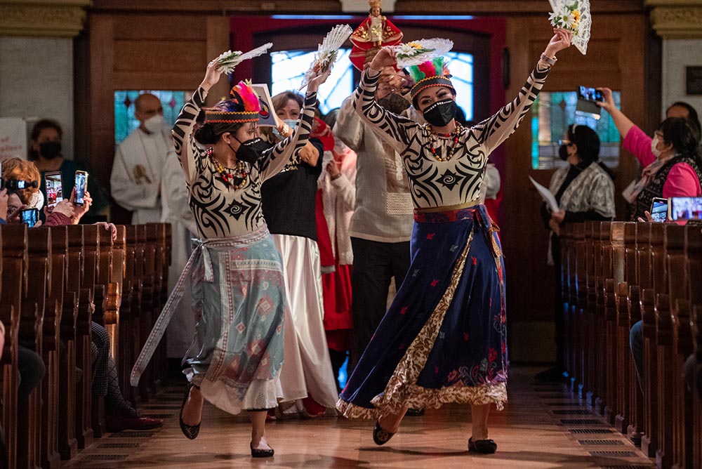 Leosan Marie Heefner, left, and Katrina Ebersohl of the Sinulog Dance Company of Dallas lead a special procession celebrating the 500th Anniversary of Christianity in the Philippines at the Cathedral Shrine of the Virgin of Guadalupe on Jan. 22. (Ben Torres/Special Contributor)