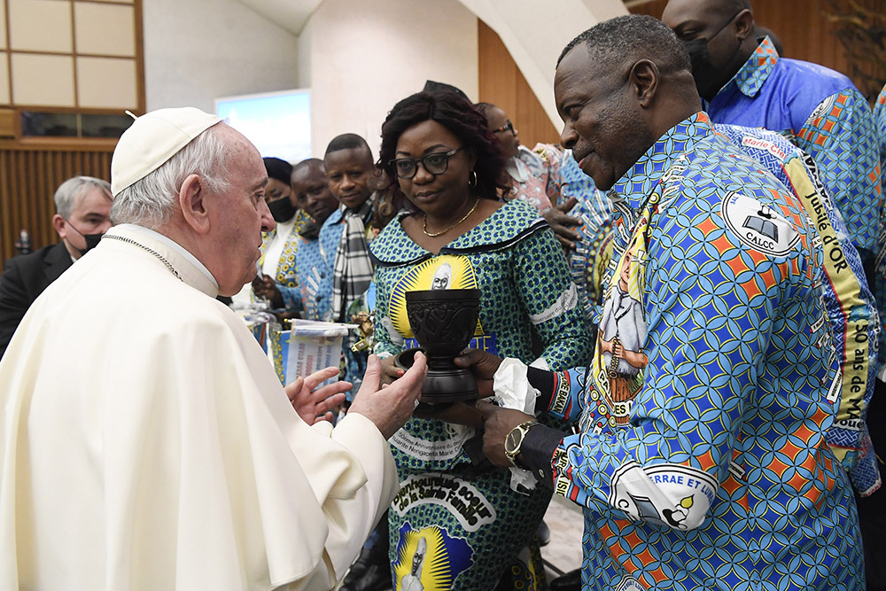 Pope Francis greets pilgrims from Congo during his general audience in the Paul VI hall at the Vatican March 2, 2022. (CNS photo/Vatican Media)