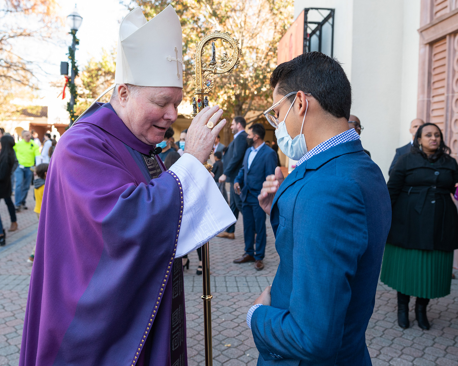 El obispo Edward J. Burns saluda a un feligrés al término de la Misa inaugural de la fase preparatoria del sinodo 2024, el 12 de diciembre de 2021en la parroquia de Santa Ana en Coppell.