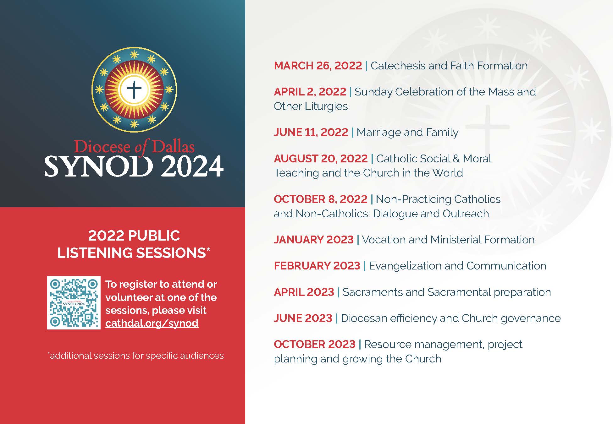 I would like to invite and strongly encourage everyone, no matter your level of engagement with the Church, to come be a part of the listening sessions that will be taking place over the next two years. It is both a historic and unique opportunity to be able to share your experience of the diocese with others and to be an integral part of the Diocese of Dallas’ efforts to embrace the apostolic mission of witnessing to Christ with renewed fervor. Be sure to check the listening session schedule accompanying this column and note that each session will have a theme that the discussion questions will focus on. I’d also encourage you to visit www.cathdal.org/synod to learn more about the Diocese of Dallas Synod 2024 and to register for any of the listening sessions.