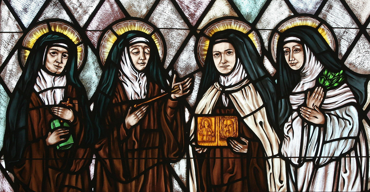 Sts. Edith Stein, Teresa of Ávila, Therese of Lisieux and Catherine of Siena are represented in stained glass at St. Thérèse of Lisieux Church in Montauk, N.Y. The Catholic Church needs women saints, Pope Francis said in a message to a conference in Rome on “Women Doctors of the Church and Co-Patronesses of Europe.” (CNS photo/Gregory A. Shemitz, Long Island Catholic)