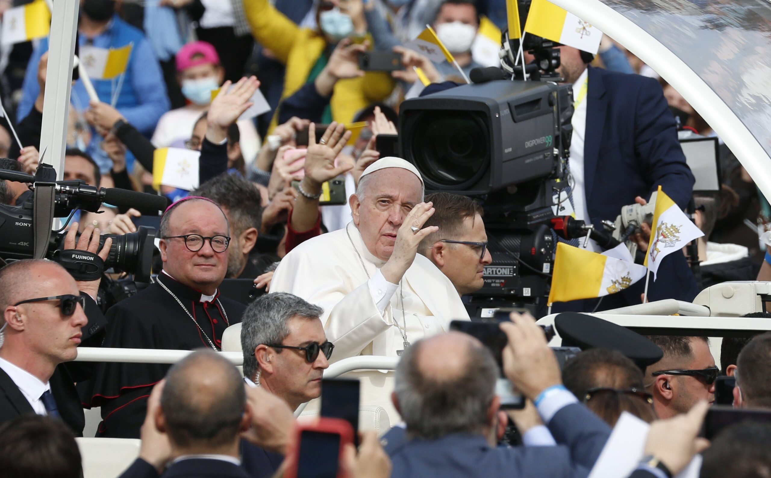 Pope Francis is accompanied by Archbishop Charles Scicluna of Malta as he greets the crowd before celebrating Mass at the Granaries in Floriana, Malta, April 3, 2022. (CNS photo/Paul Haring)