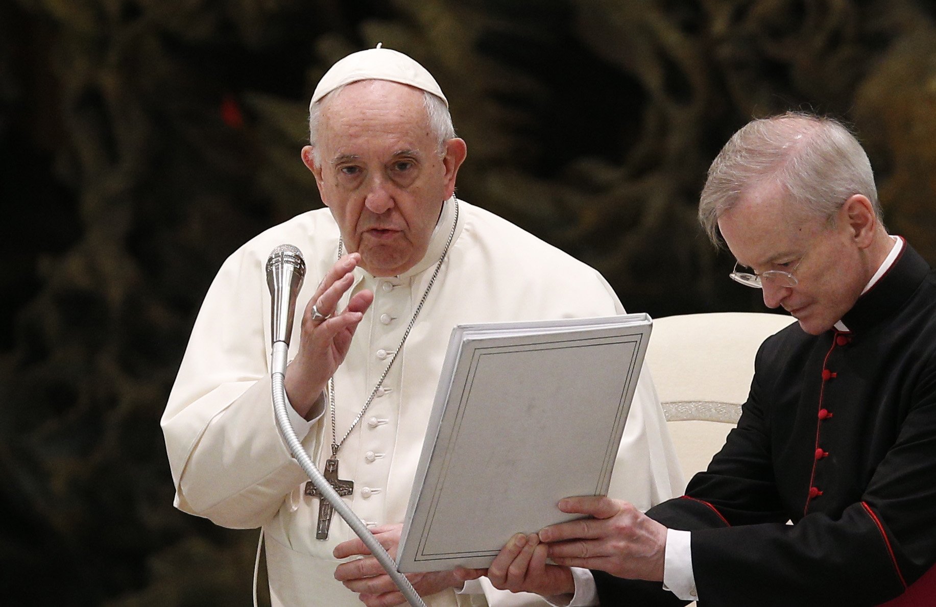 Pope Francis delivers his blessing during his general audience in the Paul VI hall at the Vatican April 13, 2022. (CNS photo/Paul Haring)