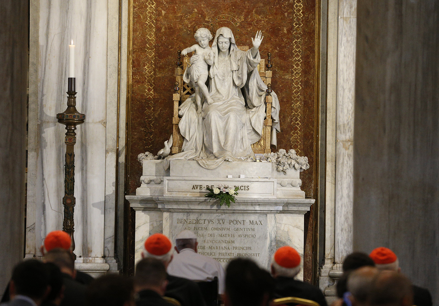 The statue of Mary, Queen of Peace, is a place Romans leave small notes with their prayer intentions. After the service, the pope did likewise, leaving a handwritten note — dated and signed — that said, “Mother, please, I ask for the holiness of the clergy.”