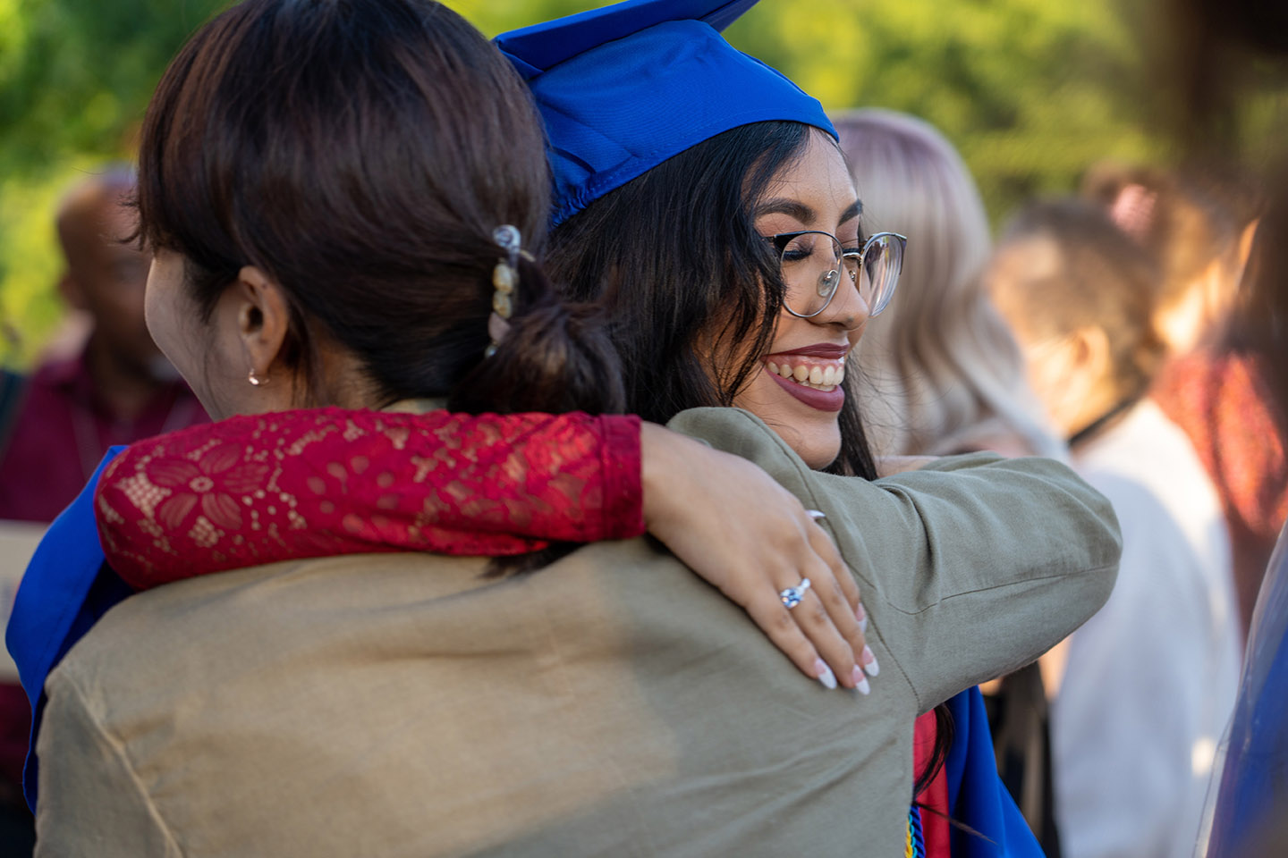 Cielo Martínez abraza a una amiga que la felicita después de su graduación el 27 de mayo, de la preparatoria Bishop Dunne. Cielo Martínez abraza a una amiga que la felicita después de su graduación el 27 de mayo, de la preparatoria Bishop Dunne. Fotos RC/Michael Gresham