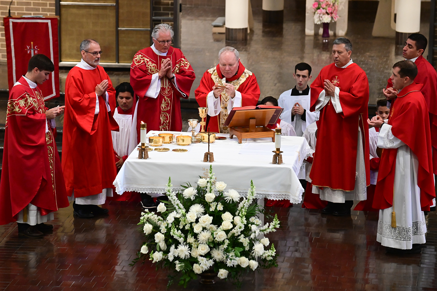 Bishop Edward J. Burns, center, prepares the Eucharist for Communion during the celebration of the 75th anniversary Mass of St. Bernard of Clairvaux Catholic Parish on June 5. Also pictured, from left, are Father Luis Prado, IVE, pastor of St. Bernard of Clairvaux; Deacon Leo Cortinas, Deacon Kevin Bartholomew, Deacon Oscar Miranda, Father Jaime Abundiz, IVE, and Father Andy Kmetz, IVE. (Ben Torres/Special Contributor)