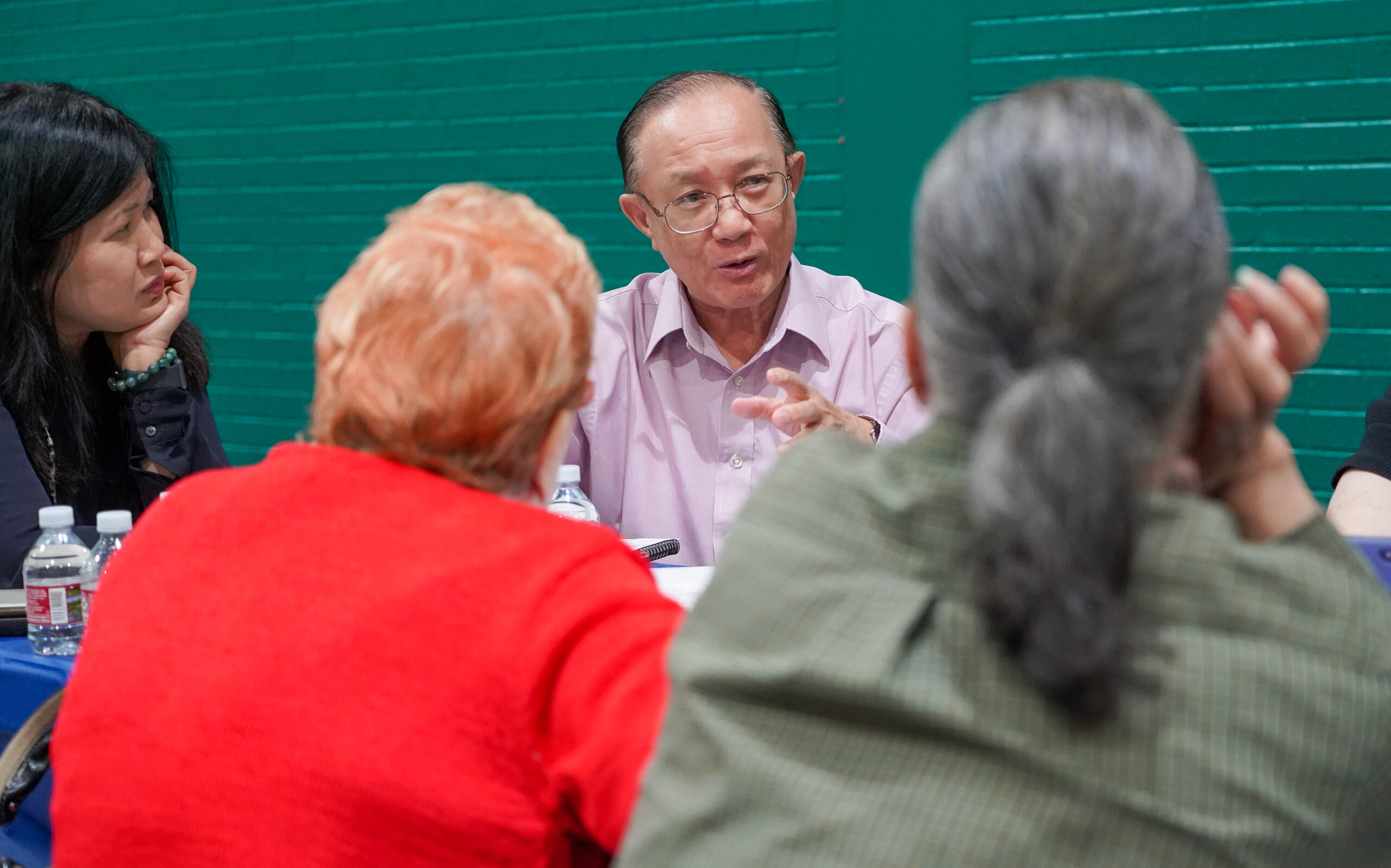 Toi Le, a parishioner at Mother of Perpetual Help Catholic Church, makes a point at a small-table discussion during the Diocese of Dallas Synod listening session on Marriage and Family, held June 11 at St. Mark Catholic School in Plano. (Michael Gresham/The Texas Catholic)