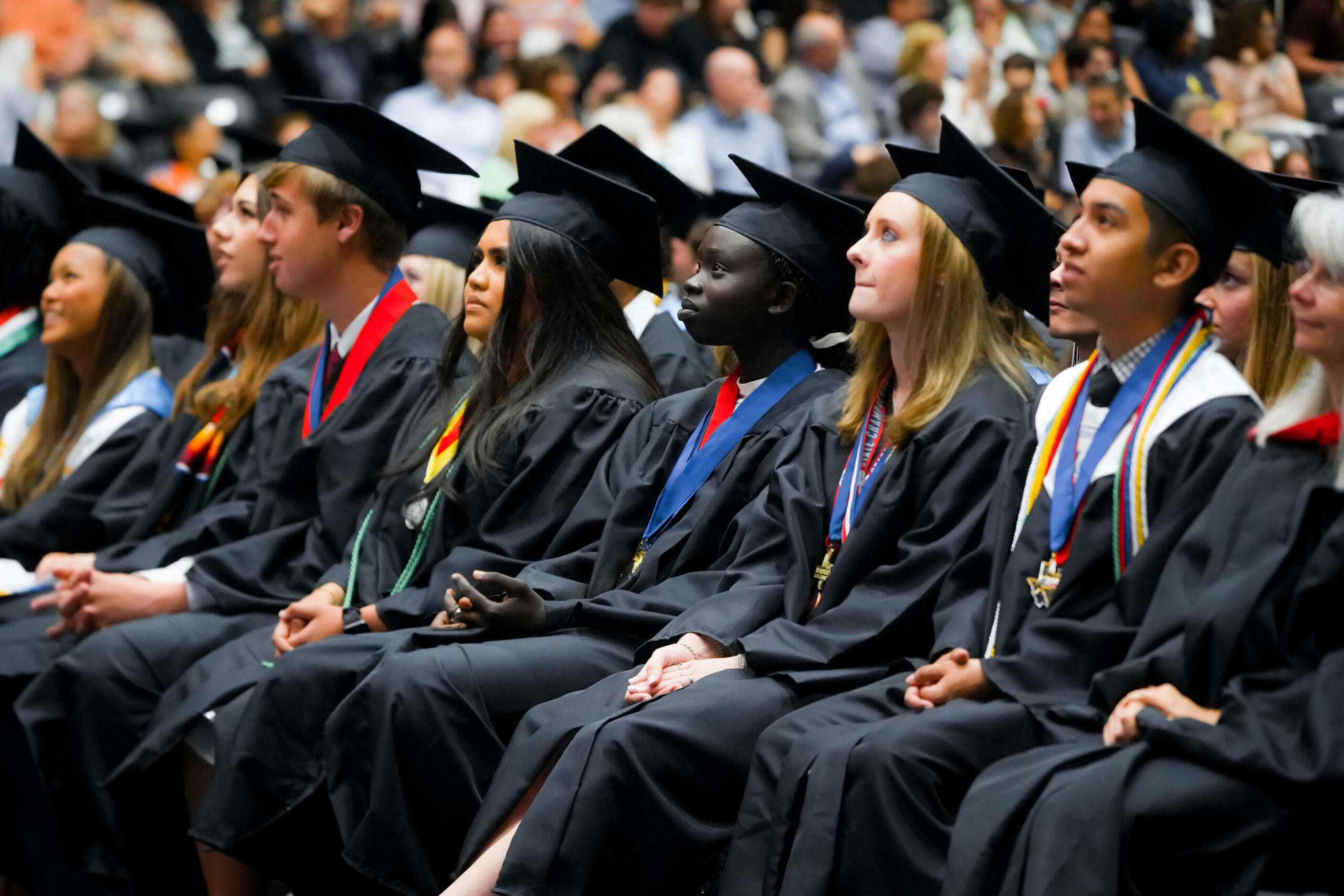 Ayen Angoi, center, sits among her peers as a member of the Bishop Lynch High School Class of 2022 during their commencement ceremony May 15 at the Curtis Culwell Center in Garland. (Drew Merino/Bishop Lynch High School)