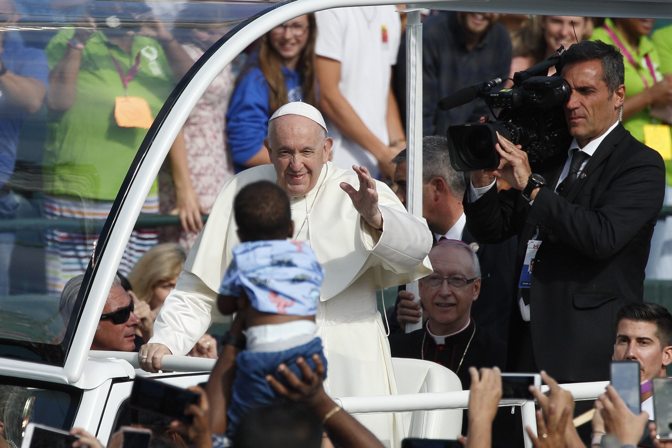 Organizers said they had distributed 60,000 tickets for Pope Francis’ Mass in the stadium on the feast of Sts. Joachim and Anne, Jesus’ grandparents. But the pope’s arrival was delayed briefly as ticket checkers struggled to get people into the stadium efficiently.