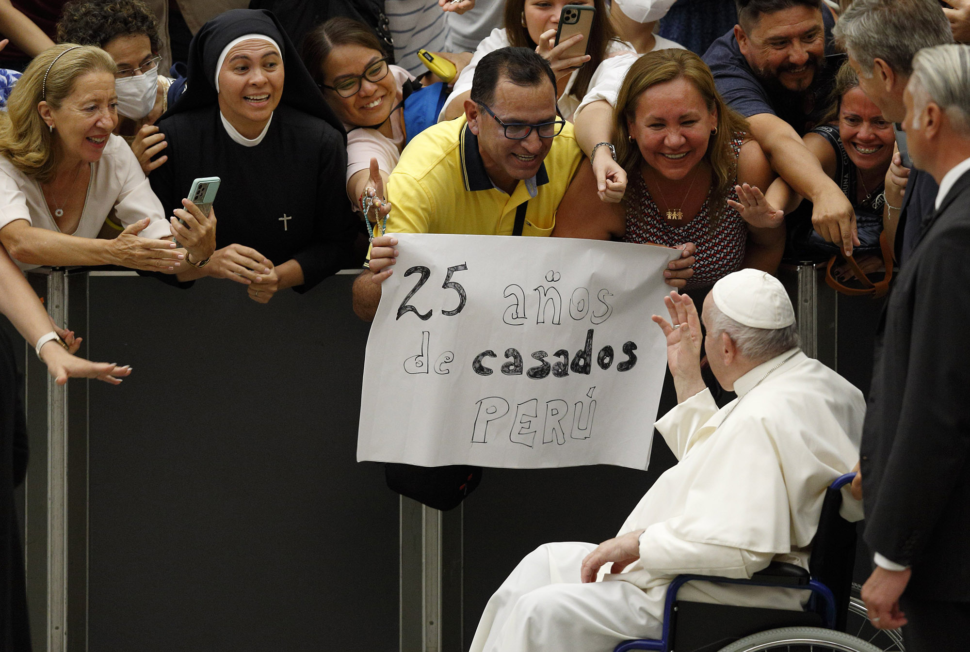 Pope Francis greets people as he leaves his general audience in the Paul VI hall at the Vatican Aug. 17, 2022. The sign in Spanish celebrates a couple’s 25 years of marriage. (CNS photo/Paul Haring)