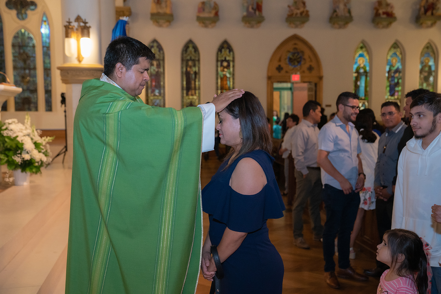 El padre José Manuel Contreras, bendice a una feligresa durante la Misa del 13 de agosto en la Catedral de Dallas.