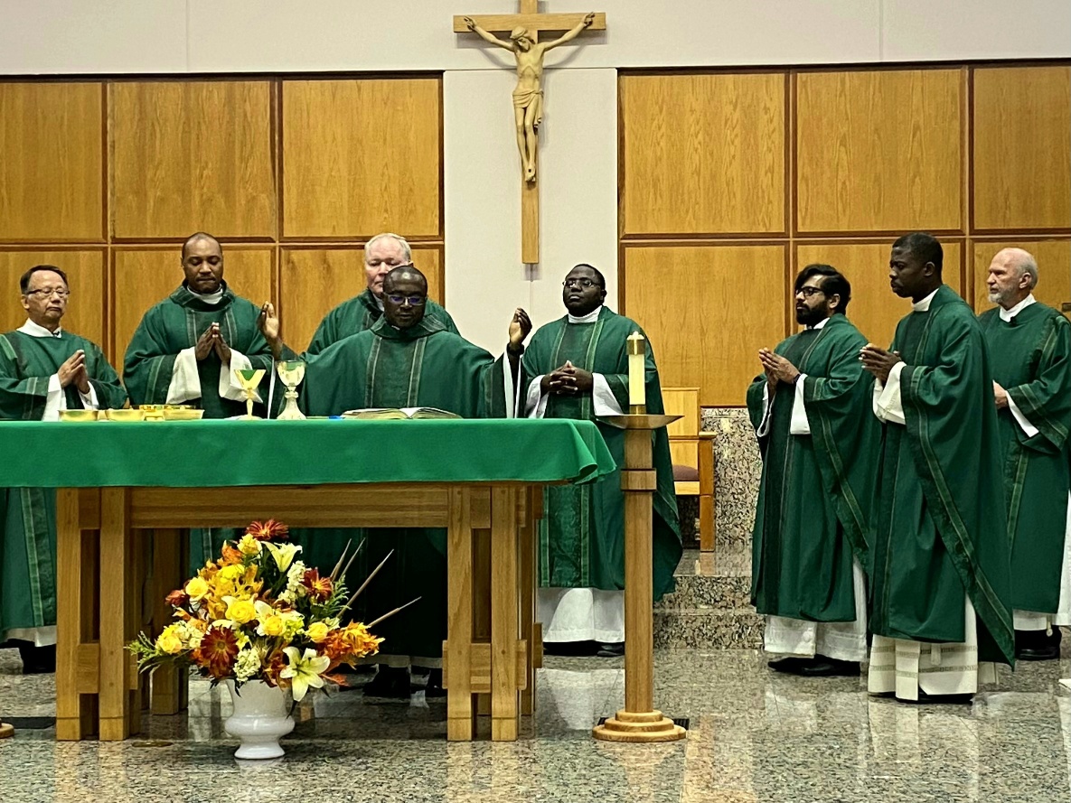 Father Jacob Dankasa concelebrates Mass with Bishop Edward J. Burns and other priests on Sept. 17 during a Mass in which Bishop Burns installed Father Dankasa as pastor of Holy Family of Nazareth Catholic Church in Irving. (Courtesy photo)