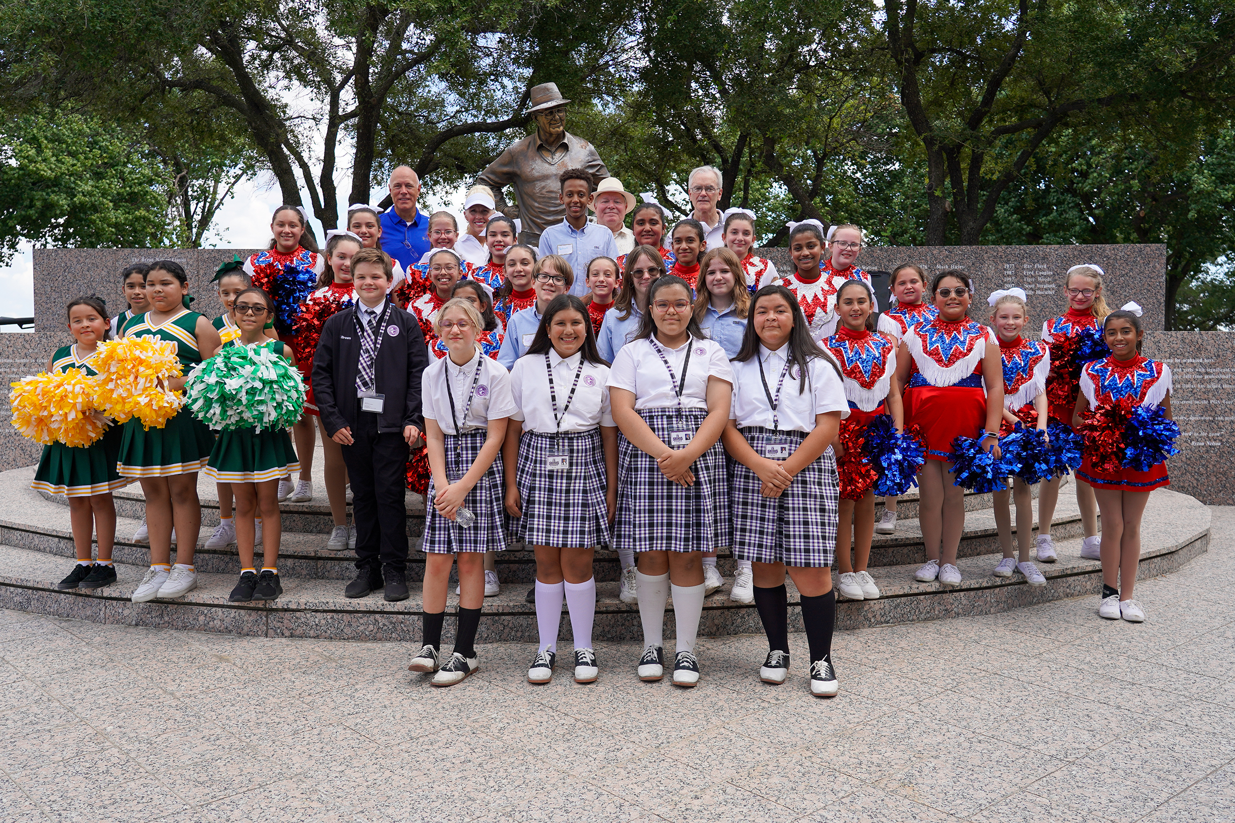 Tom and Sue Merkel, back row from left, chairs of the 12th Annual Bishop’s Invitational Golf Tournament, pose with Bishop Edward J. Burns, Auxiliary Bishop Greg Kelly and students from St. Bernard of Clairvaux Catholic School, Mary Immaculate Catholic School, St. Cecilia Catholic School and St. Philip & St. Augustine Catholic Academy prior to the start of the tournament Sept. 19 at the TPC-Four Seasons Resort and Club in Las Colinas.