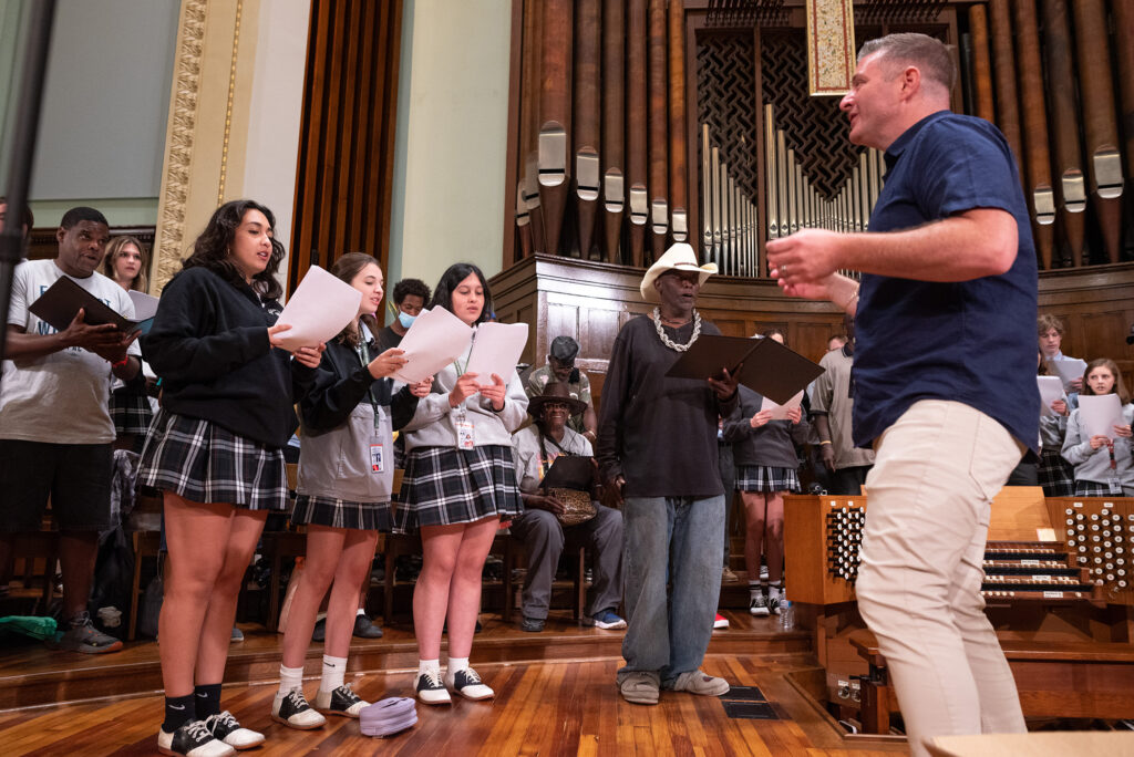 “My preconceptions of homelessness were completely thrown out the window,” senior Lucia Colindres said of her first participation in a joint rehearsal years ago in downtown Dallas’ First Presbyterian Church, across the street from The Stewpot shelter. “I remember the ambiance, the energy in the room being very positive. Very uplifting.”