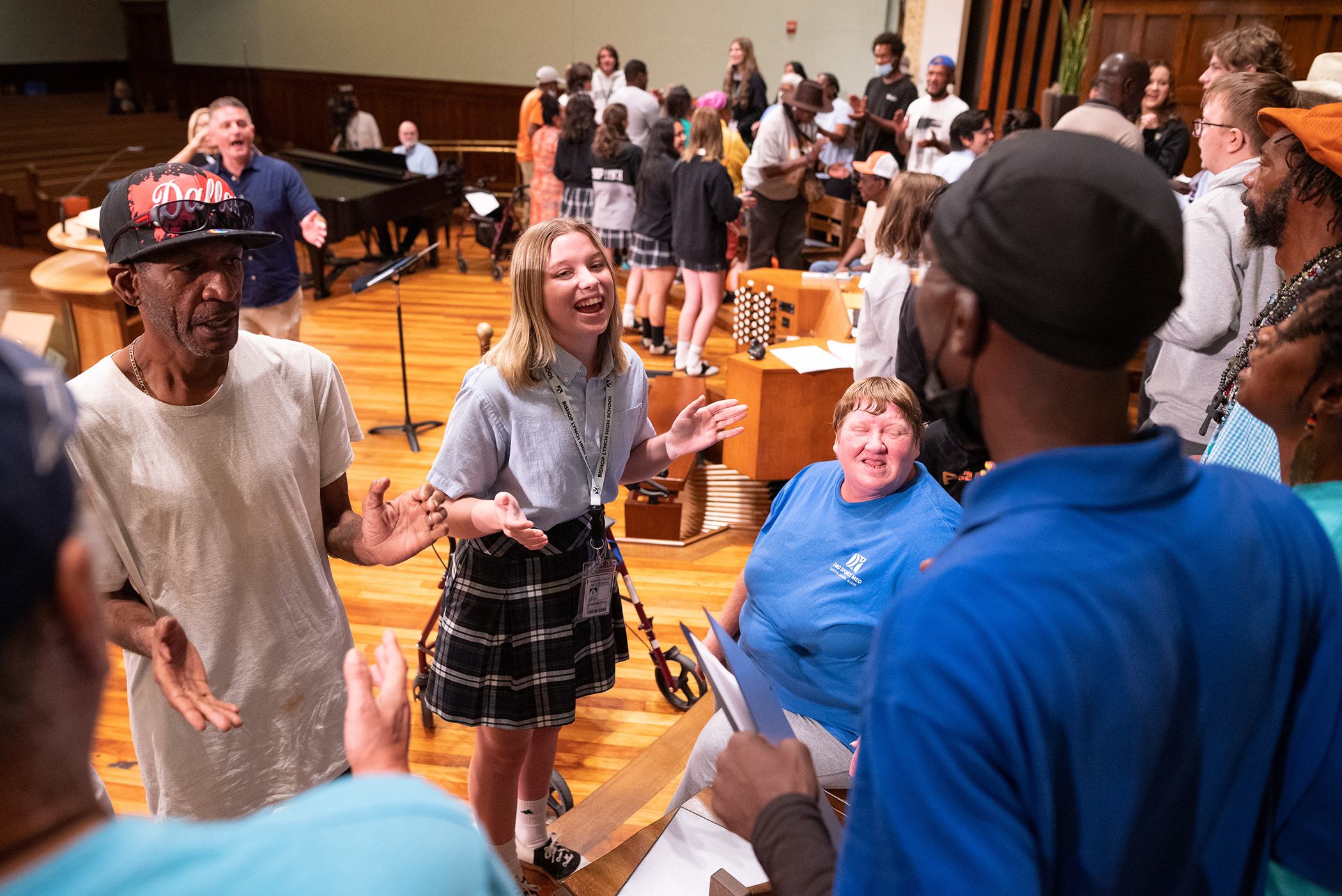 Bishop Lynch High School Friar Choir student Amanda Earp performs alongside members of the Dallas Street Choir during a special rehearsal with both choirs at First Presbyterian Church of Dallas on Sept. 21. The students participated in the rehearsal while also providing members of the street choir with lunches and uplifting notes. (Ben Torres/Special Contributor)