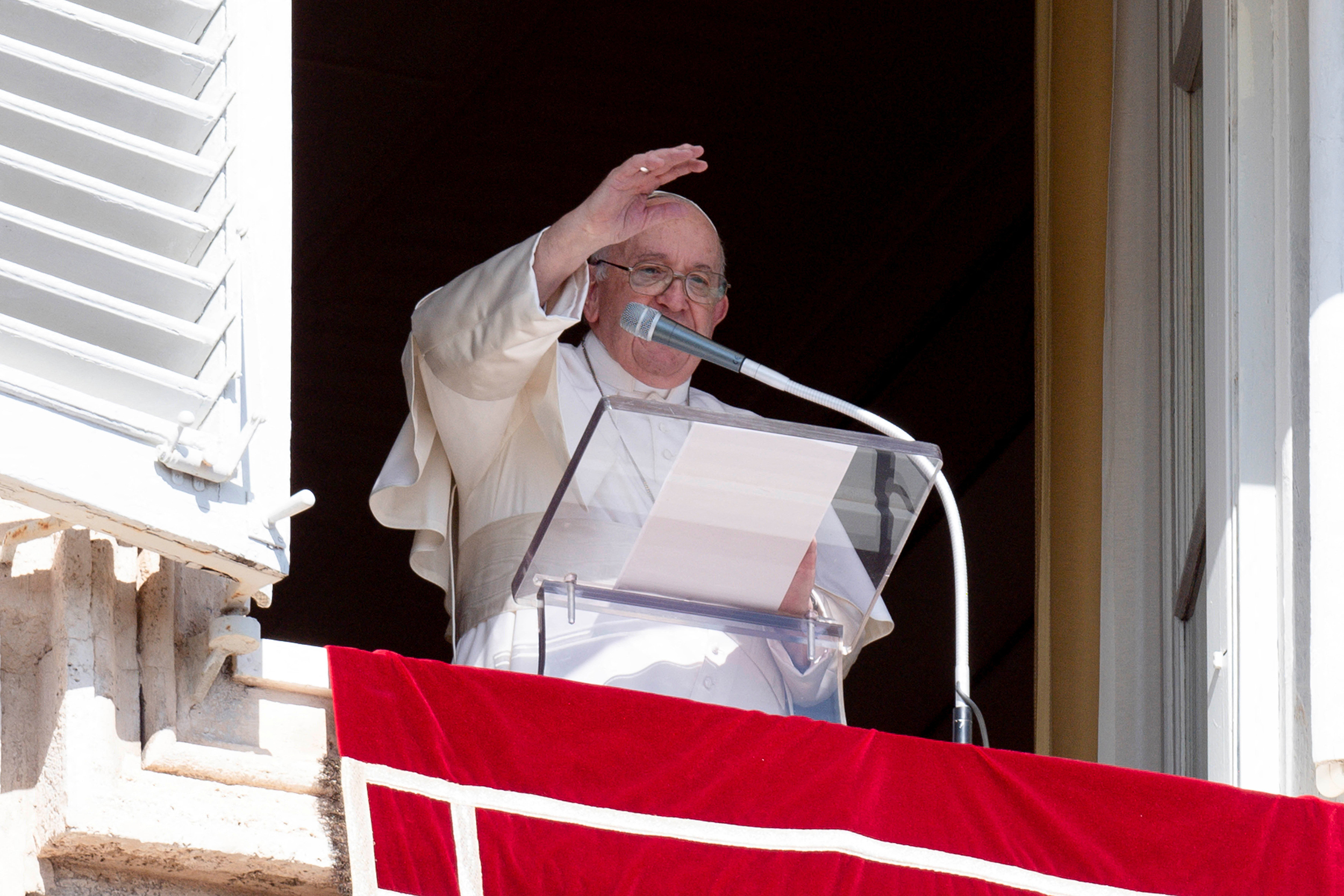 Pope Francis waves to the crowd as he leads the Angelus from the window of his studio overlooking St. Peter’s Square at the Vatican Oct. 16, 2022. (CNS photo/Vatican Media)