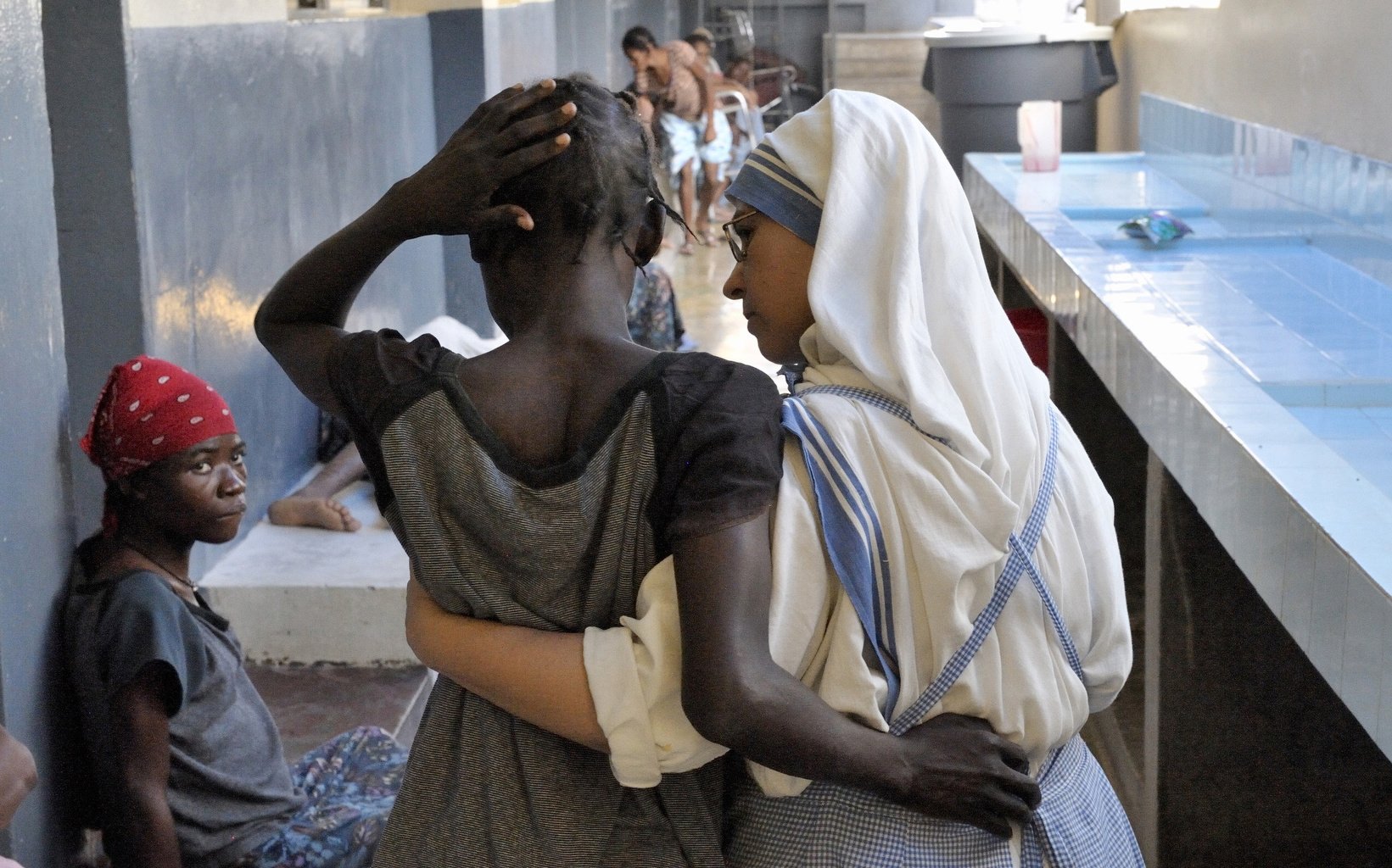 Spanish Missionary of Charity Sister Paul supports a patient at the House for the Dying in Port-au-Prince, Haiti, in this Oct. 16, 2009, file photo. The Vatican released Pope Francis’ message for World Mission Sunday, which will be celebrated Oct. 23 with the theme, “You shall be my witnesses.” (CNS photo/Paul Jeffrey)