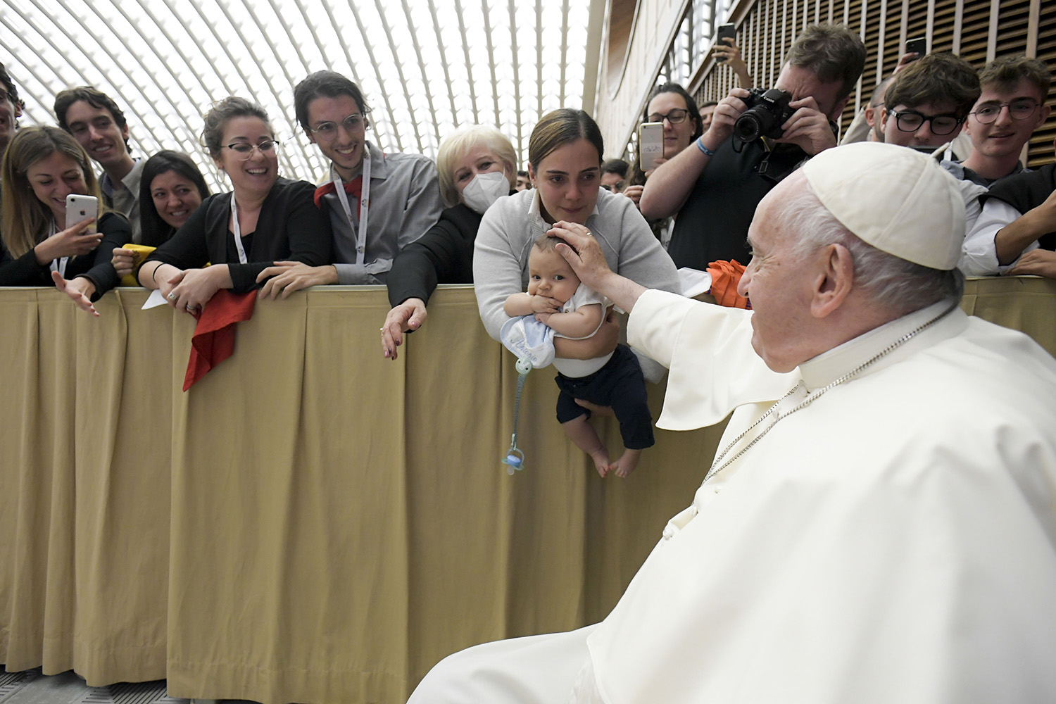 Pope Francis pats a baby’s head during an audience at the Vatican with members of the young adult section of Italy’s Catholic Action, Oct. 29, 2022. (CNS photo/Vatican Media)