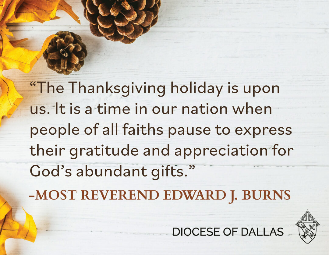I pray that you, your family, and your friends will be blessed with a wonderful Thanksgiving and that God will continue to abundantly bless the Diocese of Dallas. As we give thanks to God, the giver and the gift, let us also look forward to Advent a time of great hope in the birth of our Lord Jesus Christ.