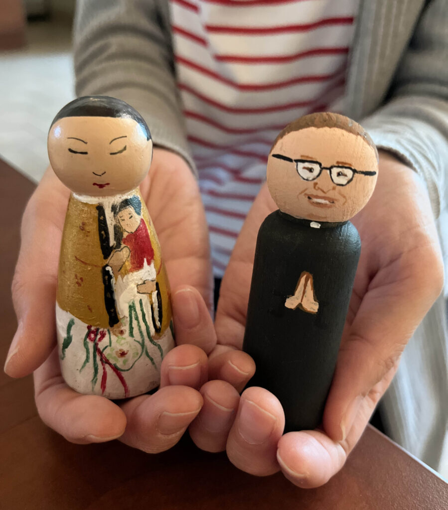 Allison Hsu began creating peg dolls as a creative way to teach faith formation and math manipulatives as she homeschooled her three daughters. She is pictured holding two peg dolls on Nov. 3 at St. Joseph Catholic Church. The peg doll on the right is a depiction of Father Stephen Ingram, the new pastor of the Richardson parish. (Michael Gresham/The Texas Catholic)