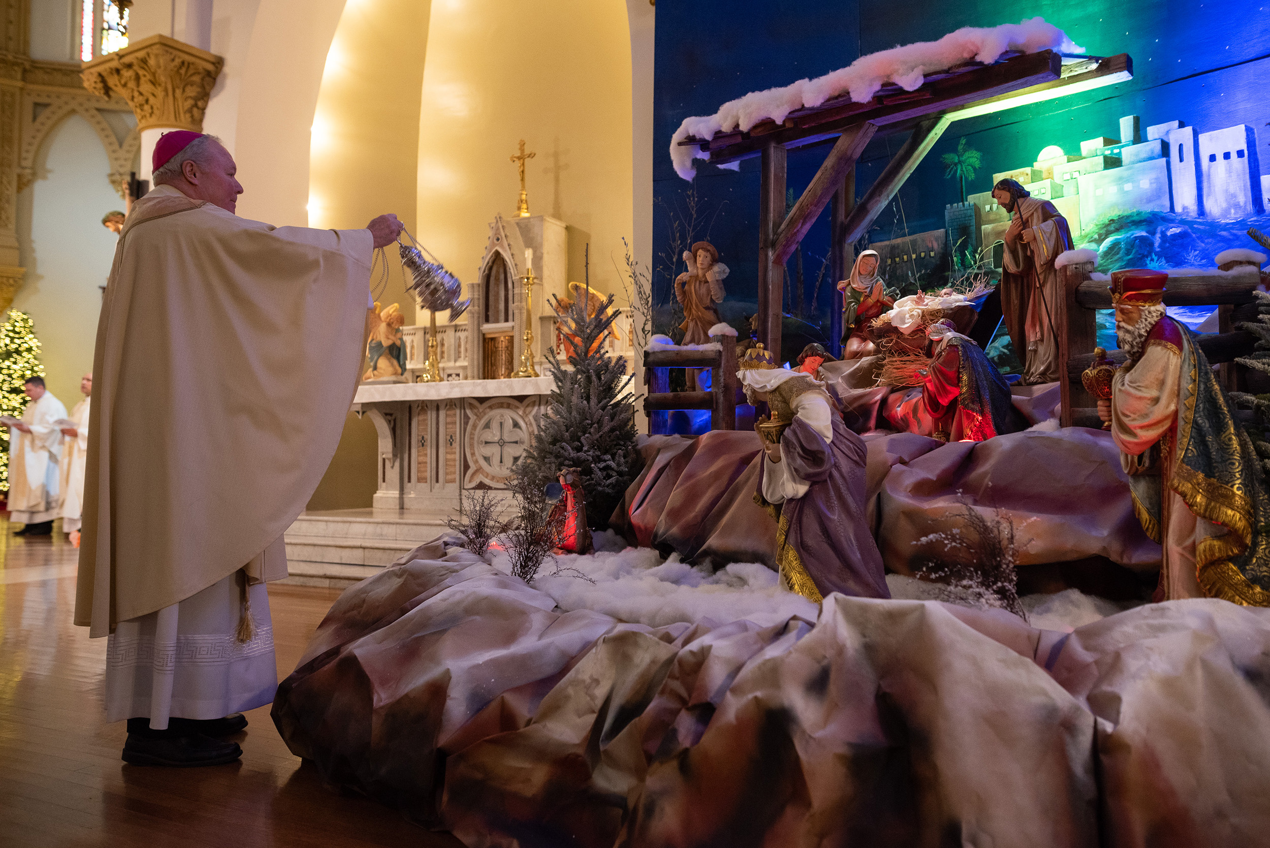 Bishop Edward J. Burns celebrates Mass on Christmas Eve at the Cathedral Shrine of the Virgin of Guadalupe on Dec. 24. (Ben Torres/Special Contributor)