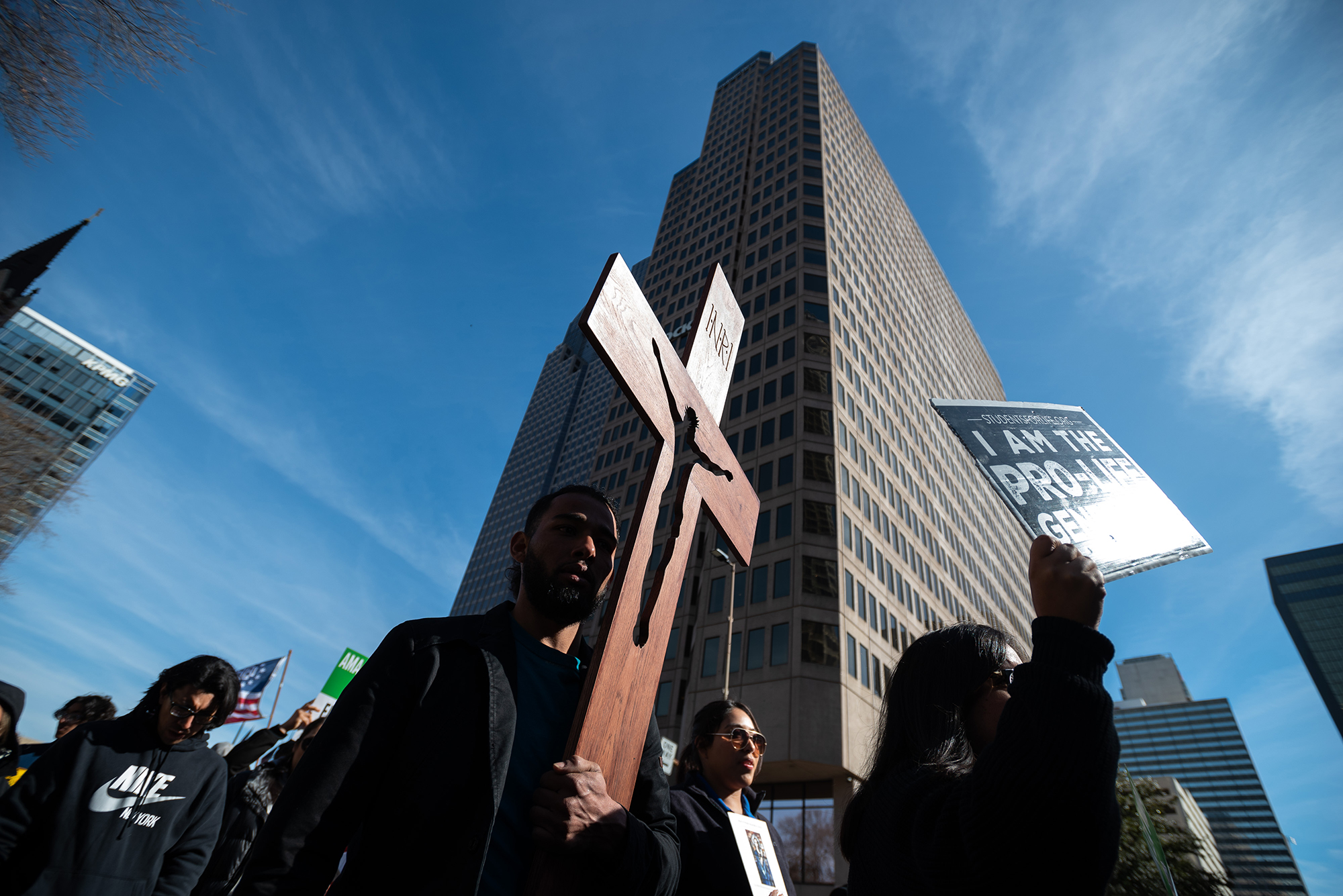A pro-life advocate carries a wooden crucifix as he marches through the streets of downtown Dallas during the annual North Texas March for Life and Rally on Jan. 14. (Ben Torres/Special Contributor)