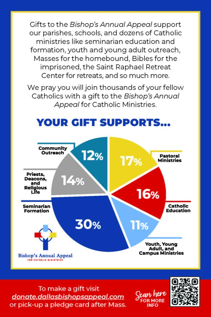 The Bishop’s Annual Appeal for Catholic Ministries is one such source as it funds a number of ministries including Seminarian Formation; Priests, Deacons, and Religious Life; Community Outreach; Pastoral Ministries; Catholic Education; and Youth, Young Adult, and Campus Ministries. This essential diocesan collection invests in the shared ministries of the Diocese of Dallas to advance the apostolic mission of the Church in North Texas.