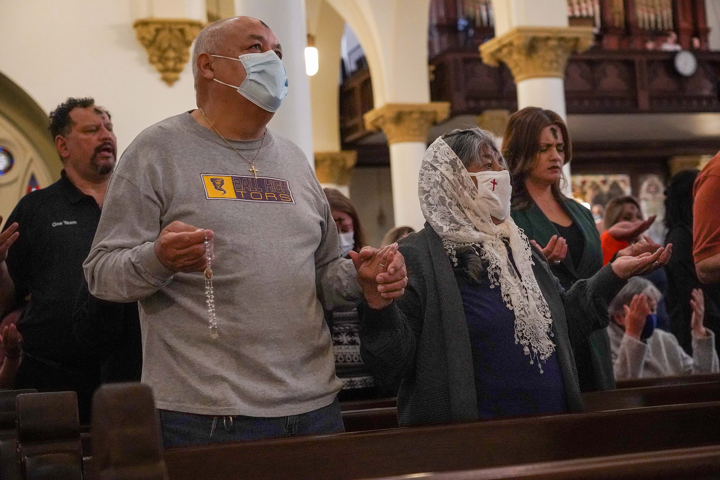 Johnny Constancio holds a rosary in one hand his wife Teodora’s hand in the other as they recite the “Our Father” during the celebration of Mass on Ash Wednesday at the Cathedral Shrine of the Virgin of Guadalupe. (MIchael Gresham/The Texas Catholic)