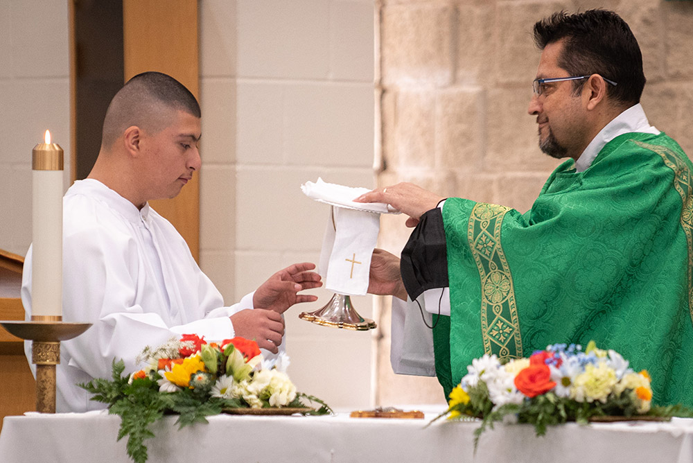Kevin Rodriguez recibe el copón de manos del diácono Ruben Vargas, después de la comunión, en la Misa del 29 de enero en la parroquia del Sagrado Corazón en Rowlett.