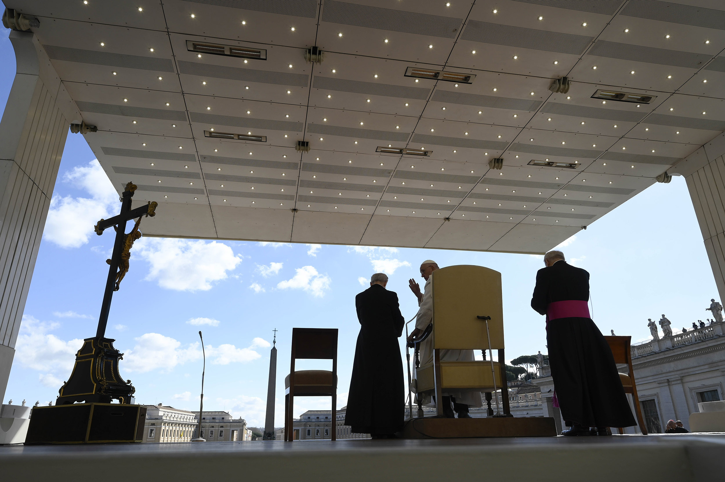 Pope Francis blesses the crowd at the end of his general audience in St. Peter’s Square at the Vatican March 15, 2023. (CNS photo/Vatican Media)