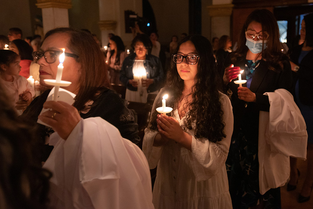 Alexia Cano, 17, sostiene una vela mientras camina en procesión junto a otros catecúmenos en el inicio de la vigilia pascual.