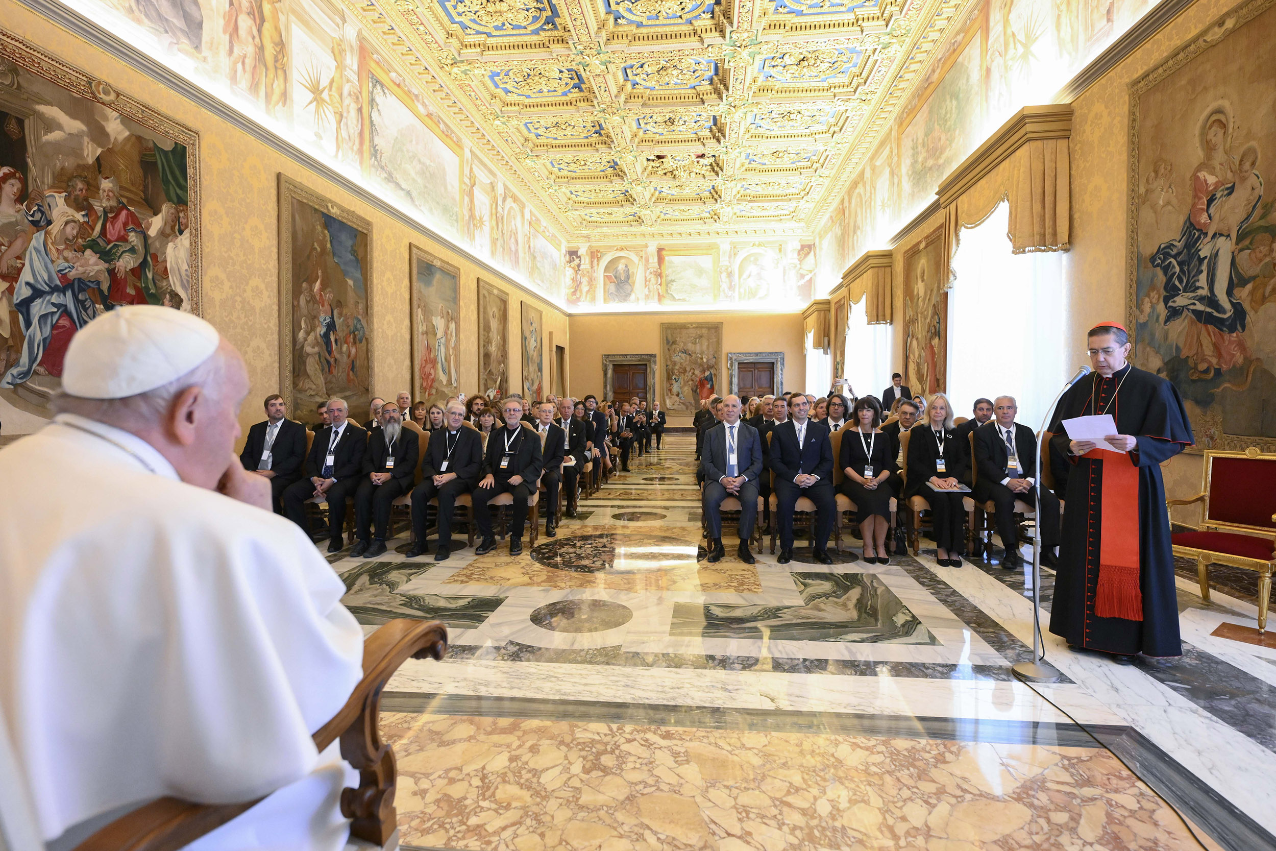 Cardinal Miguel Ángel Ayuso Guixot, prefect of the Dicastery for Interreligious Dialogue, speaks to Pope Francis at the start of an audience with participants in a conference sponsored by Argentina’s Institute for Interreligious Dialogue May 5, 2023, at the Vatican. (CNS photo/Vatican Media)