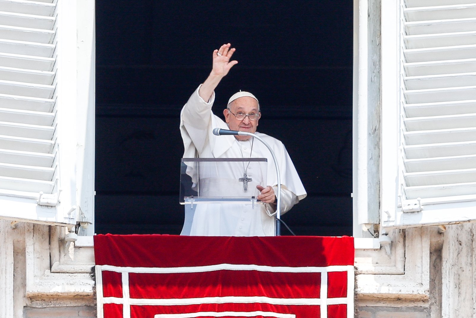 Pope Francis smiles and waves at visitors gathered in St. Peter’s Square at the Vatican after praying the Angelus June 18, 2023. Pope Francis, released from the hospital two days ago, also thanked the medical staff who had cared for him. (CNS photo/Lola Gomez)