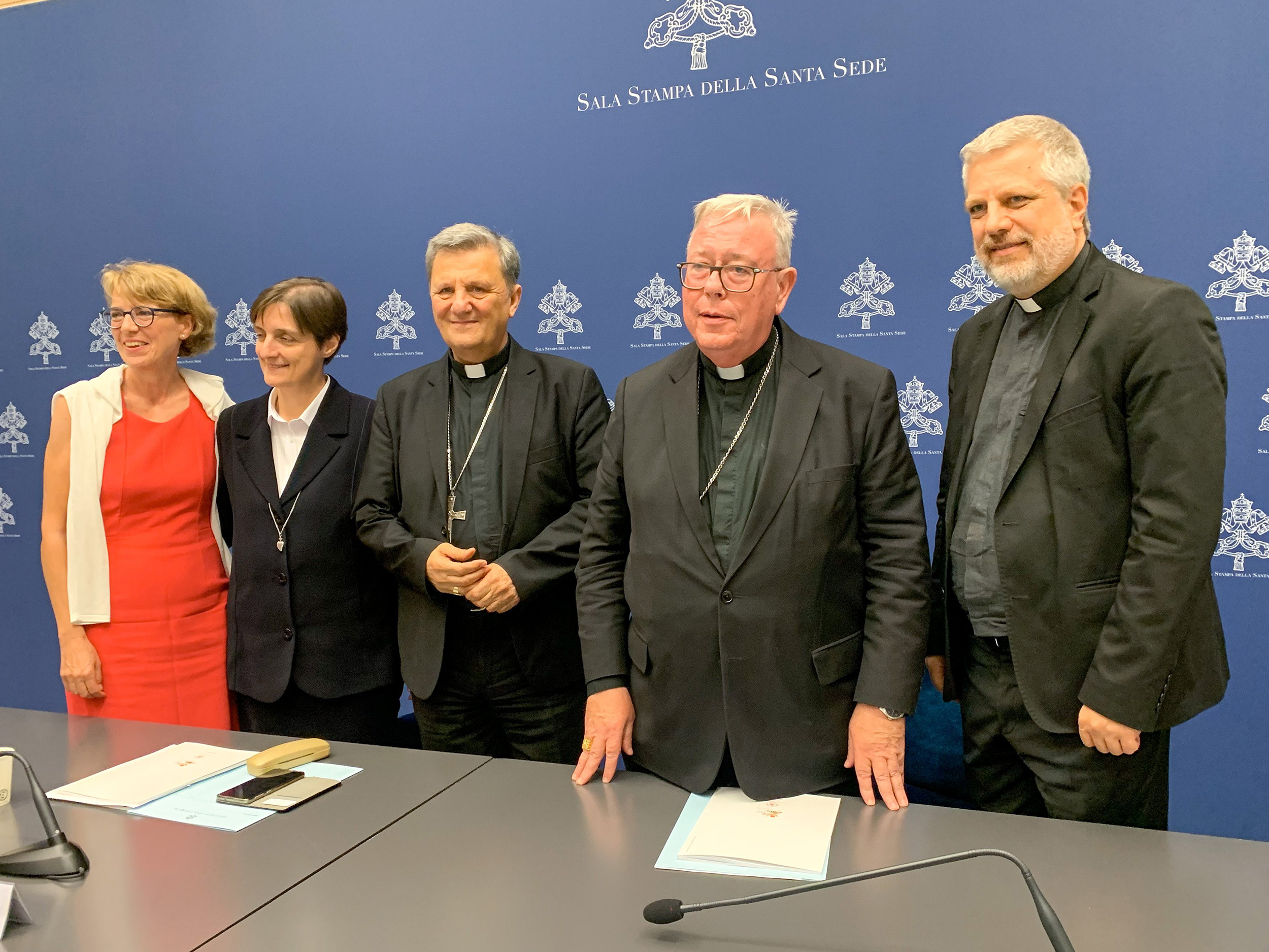 The people who presented the working document for the Synod of Bishops pose for a photo in the Vatican press office June 20, 2023. From the left are Helena Jeppesen-Spuhler, a synod participant from Switzerland; Sister Nadia Coppa, president of the women’s International Union of Superiors General; Cardinal Mario Grech, secretary-general of the synod; Cardinal Jean-Claude Hollerich, relator general of the synod; and Jesuit Father Giacomo Costa, a consultant to the synod. (CNS photo/Cindy Wooden)
